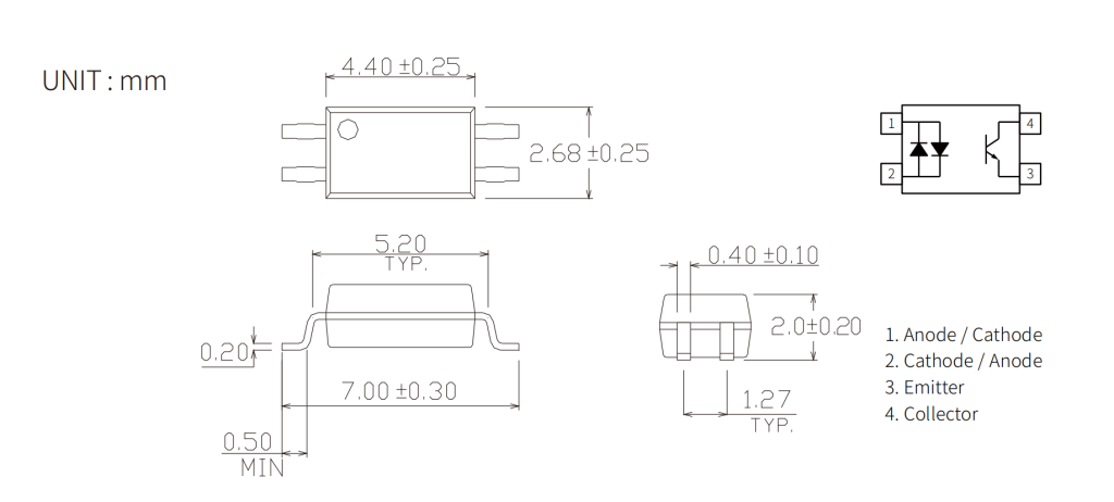 Product Package size(LxWxHmm) VF (V) BV CEO (Min) (V) V CE(SAT) (Max) (V) IF (mA) CTR (%) tr (uS) tf (uS) ton (uS) toff (uS) Topr (Min) (degC) Topr (Max) (degC) Viso (Vrms)